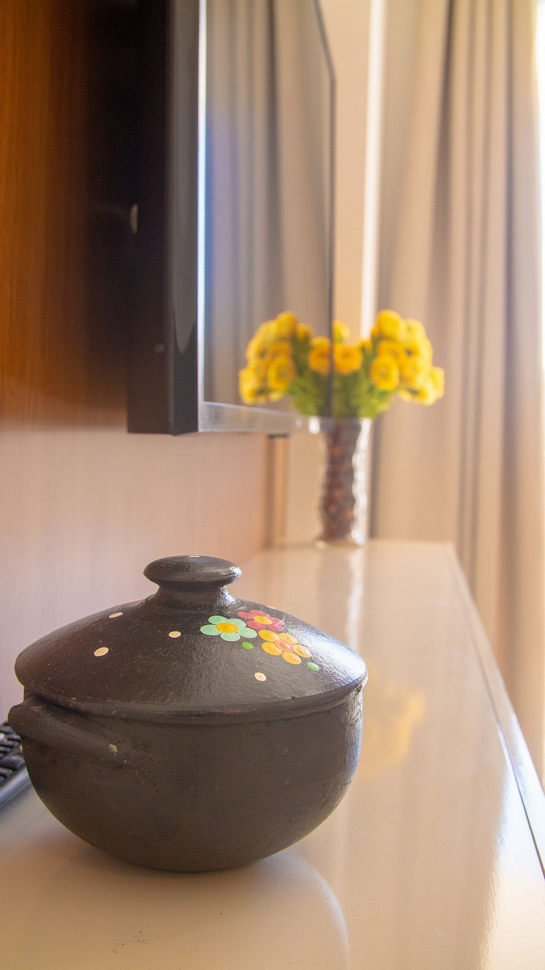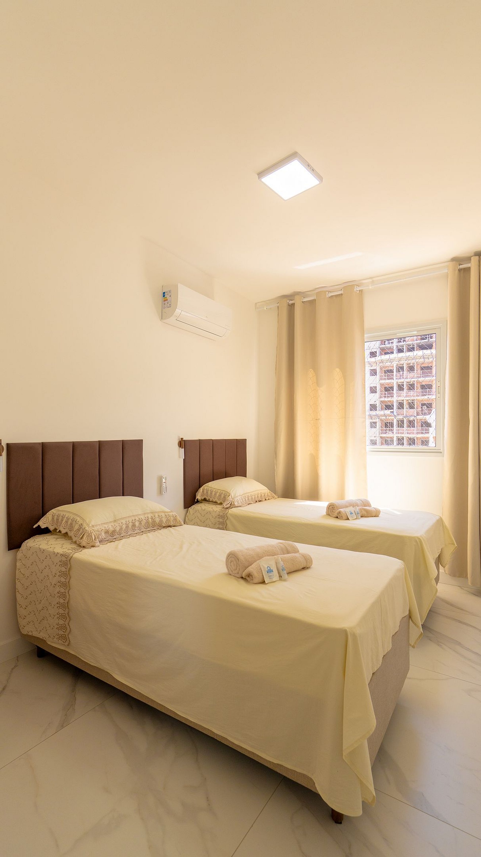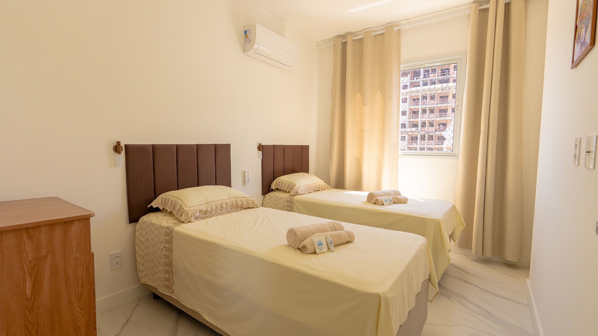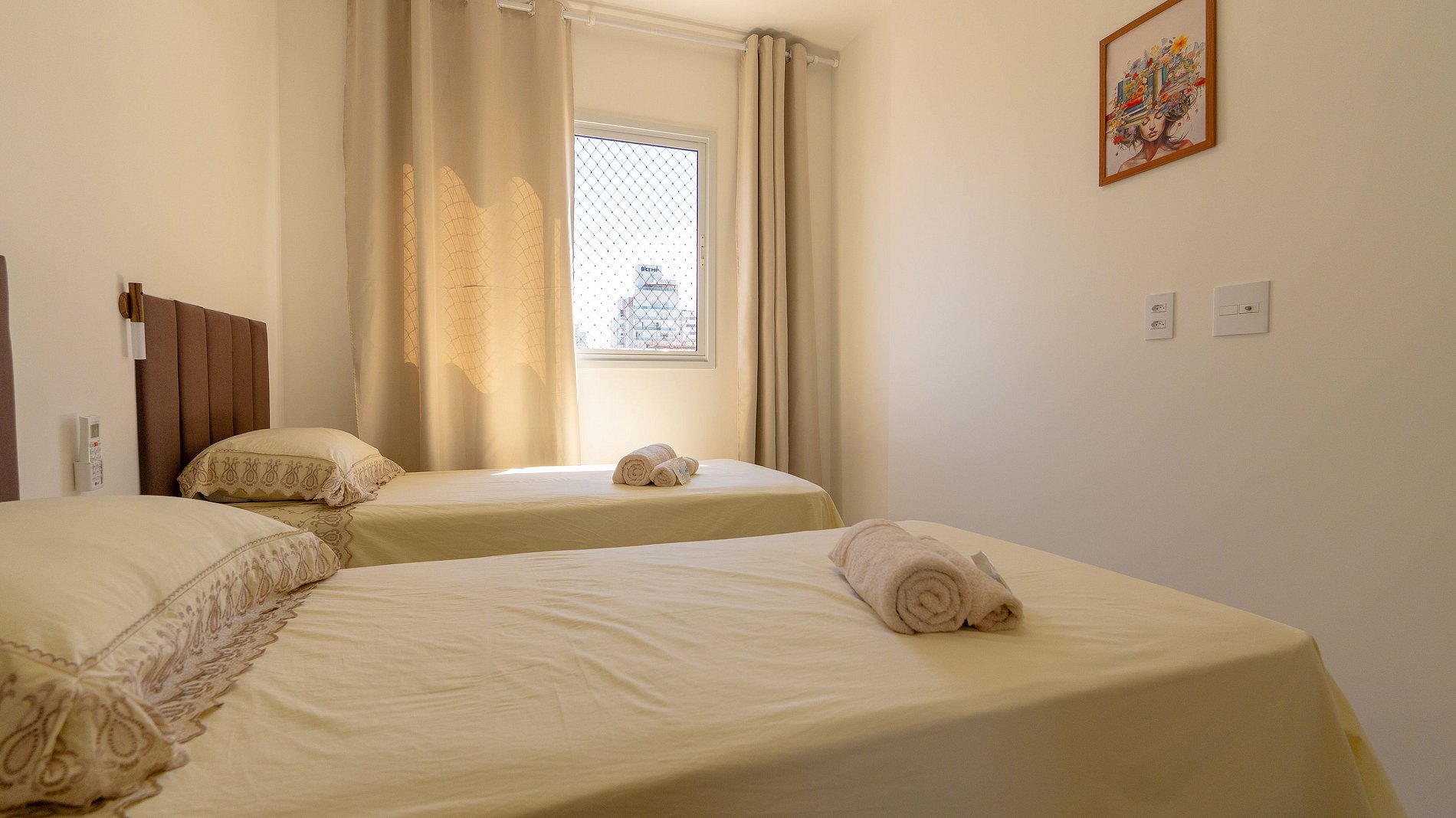 Sala de Estar e Jantar • Sofá confortável • TV Smart • Mesa de jantar • Cortinas⸻Cozinha Completa • Geladeira • Fogão com forno • Micro-ondas • Cafeteira • Utensílios completos • Máquina lavar • Varal⸻ Quartos • Suíte: cama casal + ar-condicionado • Quarto 2: duas camas solteiro + ar-condicionado • Cortinas blackout em ambos